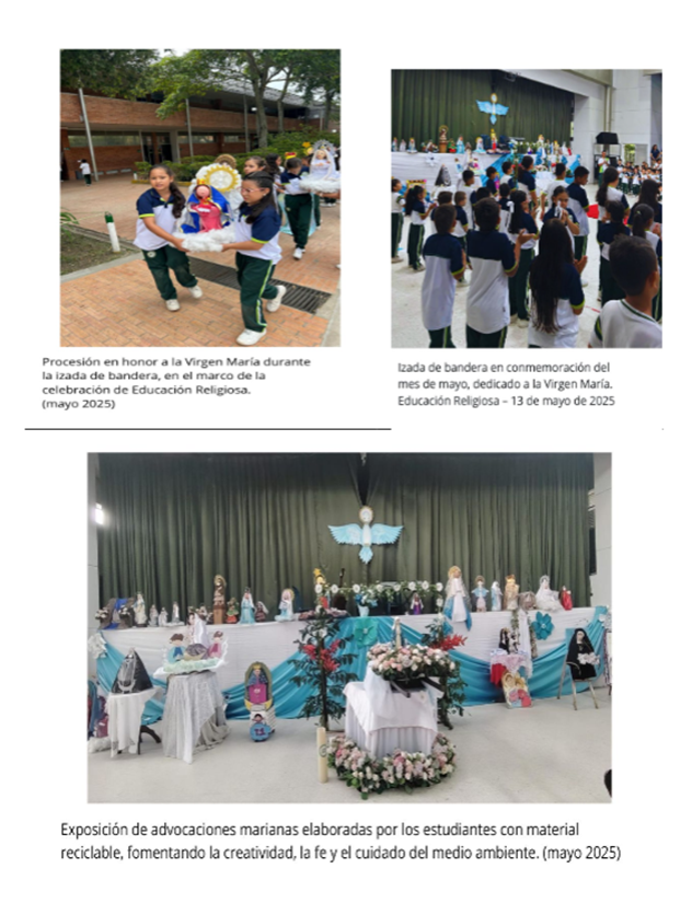 El pasado 13 de mayo, se llevó a cabo una significativa izada de bandera en nuestro colegio Augusto E. Medina de Comfenalco, en la cual se destacó una innovadora propuesta institucional: la presentación y oficialización de las advocaciones marianas como parte de nuestros actos cívico-culturales.